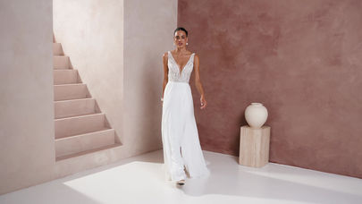 Abito da sposa in chiffon scintillante, linea A, con profondo scollo a V e inserto in tulle. Il corpetto illusion è impreziosito da perle, paillettes e perline ricamate a mano. Una cintura di perline sottolinea il punto vita. Gonna in chiffon con spacco laterale e strascico a cappella. Schiena a V con bottoni e zip invisibile.